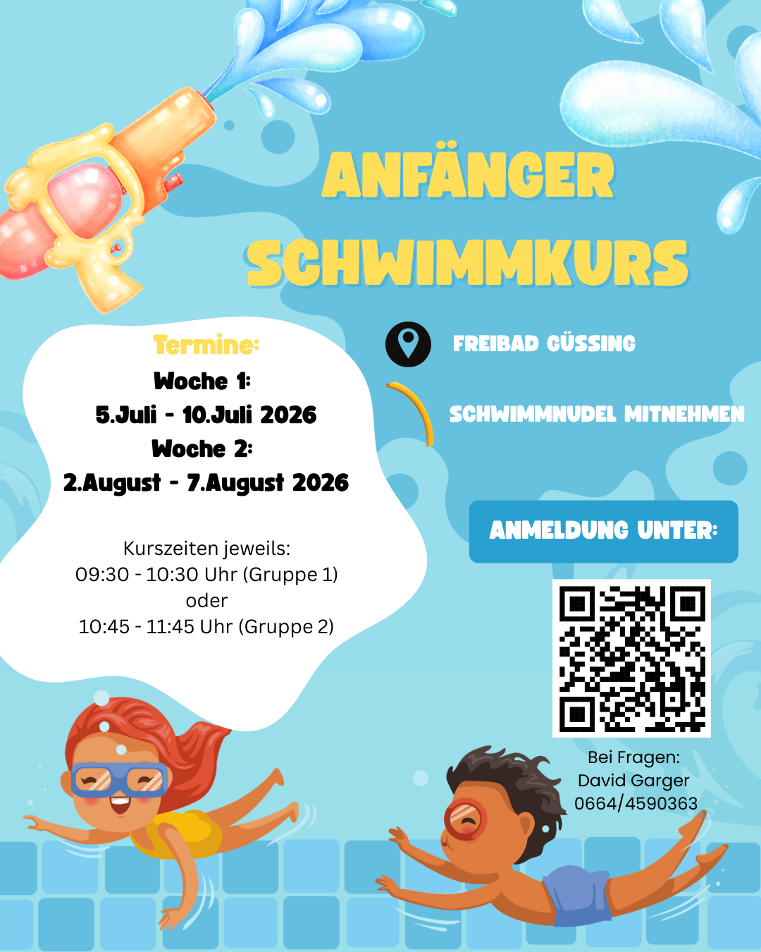 Auch heuer bietet der SCHULSPORTVEREIN BORG GÜSSING zweimal die Möglichkeit an Kinderschwimmkursen teilzunehmen. Aufgrund der hohen Nachfrage in den vergangenen Jahren werden im Sommer eine Woche im Juli und eine Woche im August angeboten werden.